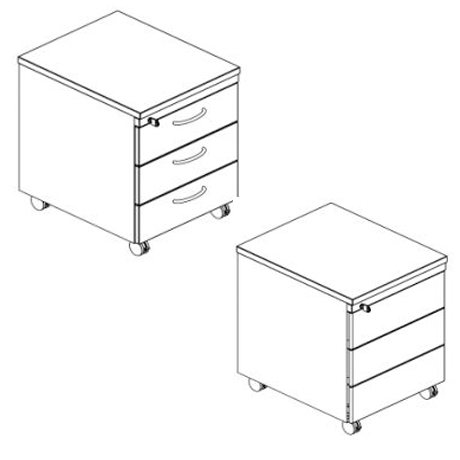 Rodados (com 2 ou 3 gavetas) com rodas frontais com travão. Podem incluir tampo em melamina ou madeira (acabamentos variados).