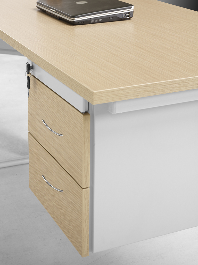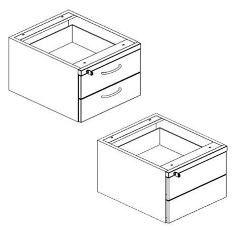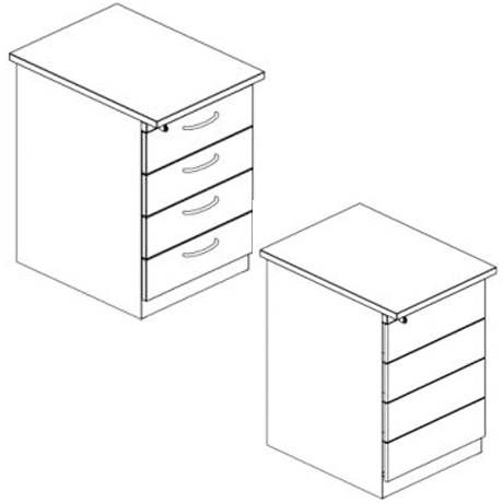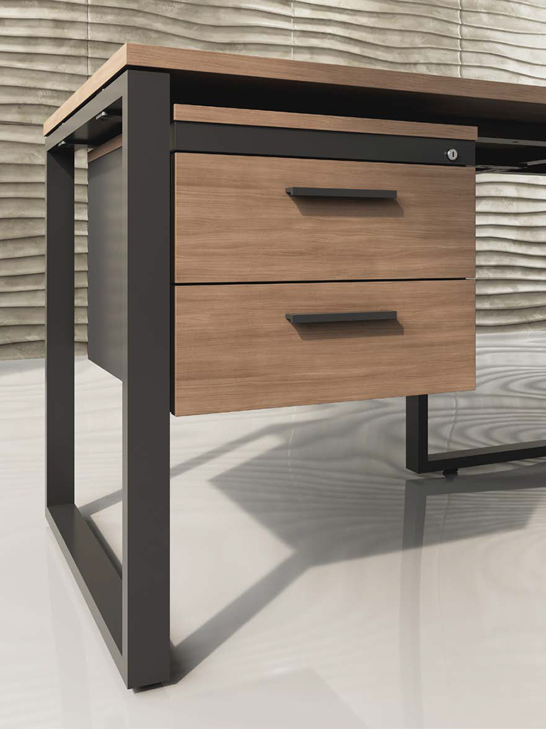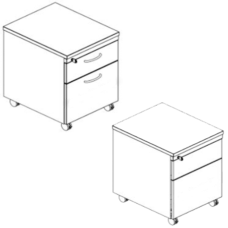Fixos (2 ou 4 gavetas). O de 2 gavetas é fixo à estrutura da secretária e o de 4 pode incluir um tampo em melamina ou madeira (acabamentos variados).